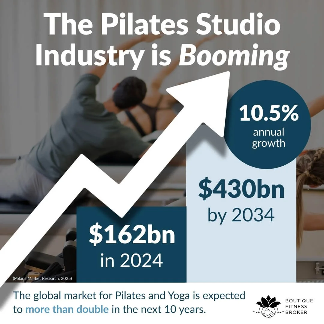 The global Pilates and yoga studio market is projected to grow from $162 billion in 2024 to over $430 billion by 2034, with an annual growth rate of 10.5% (Polaris Market Research, 2025).